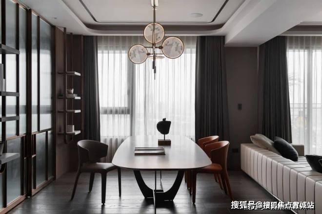 ▲餐厅旁边是书房空间,以长虹玻璃推拉门作为隔断,在金属边框的设计下,与餐厅的吊灯形成呼应,门两侧是木饰面+吊架书架的设计,也是显得简约华丽而高级.