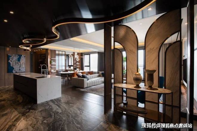 ▲玄关处加入一道金属+石材结合的屏风与端景台,布置陶艺品的装饰,让进门的第一视觉充满现代优雅的华丽感.天花上一道流线设计的造型,从玄关延伸到中岛台,也是显得更加有艺术气质.