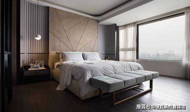 ▲卧室床头墙加入木饰面,两侧是弧形的软包质感的波纹造型板,摆上米白色的皮艺床,简约舒适的床单,床尾还有一张长凳子,整体现代优雅的卧室空间,为主人提供了一个舒适从容的休闲与睡眠体验.