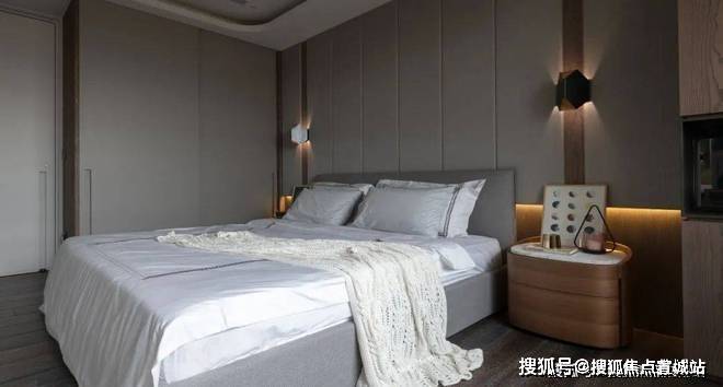 ▲床头柜上摆上精致的展示品,上方一盏球形的吊灯,在后方墙面的波纹软包造型的呼应下,也为我们布置了一个简约优雅的舒适空间感.