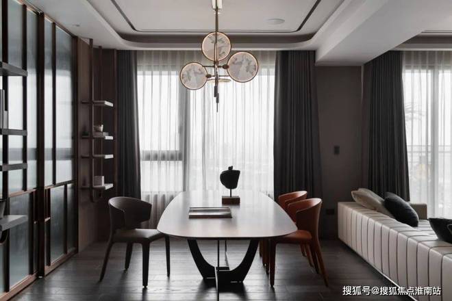 ▲餐厅旁边是书房空间,以长虹玻璃推拉门作为隔断,在金属边框的设计下,与餐厅的吊灯形成呼应,门两侧是木饰面+吊架书架的设计,也是显得简约华丽而高级.