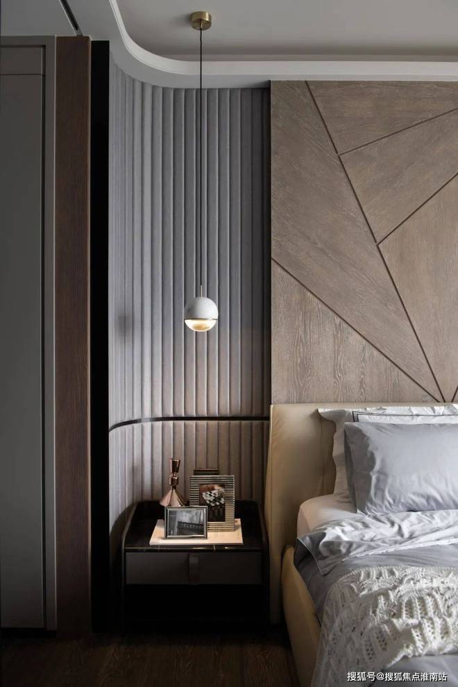 ▲床头柜上摆上精致的展示品,上方一盏球形的吊灯,在后方墙面的波纹软包造型的呼应下,也为我们布置了一个简约优雅的舒适空间感.