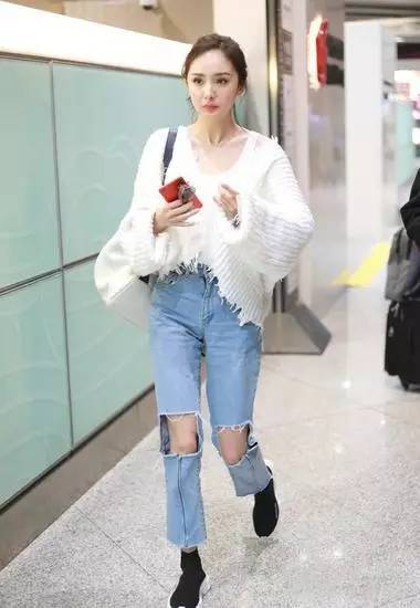 杨幂之前穿过无数次的破洞牛仔裤,还有好多次的破洞毛衣,现在连袜子都开始流行破的了嘛?!