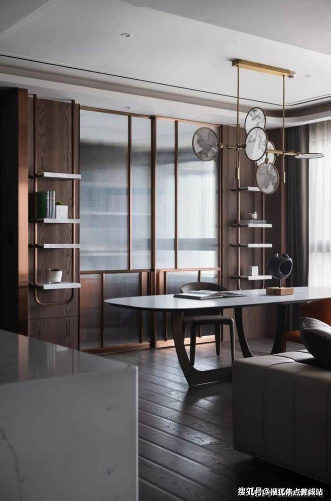 ▲餐厅旁边是书房空间,以长虹玻璃推拉门作为隔断,在金属边框的设计下,与餐厅的吊灯形成呼应,门两侧是木饰面+吊架书架的设计,也是显得简约华丽而高级.