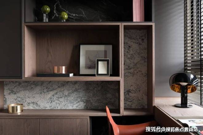 ▲书房定制上书架,靠窗定制书桌,在书架上摆着各式各样的精致小饰品,搭配橙色的办公椅,也为主人带来了一个端庄而轻松的工作与阅读空间.