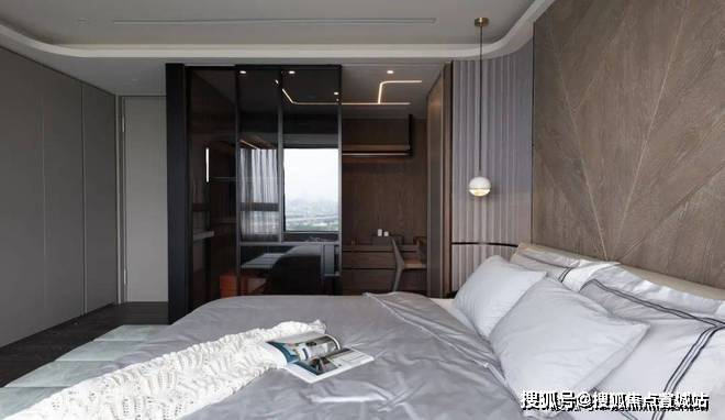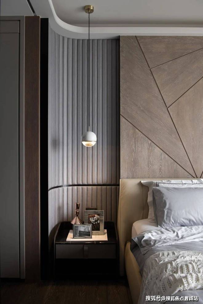 ▲床头柜上摆上精致的展示品,上方一盏球形的吊灯,在后方墙面的波纹软包造型的呼应下,也为我们布置了一个简约优雅的舒适空间感.
