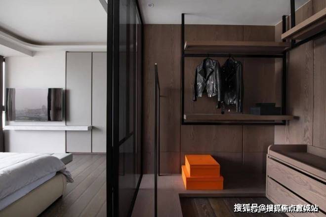 ▲玻璃隔断后的衣帽间,整体以木饰面为墙面背景,让空间更加干净而温馨;开放式的衣帽架设计为主,提供了一个方便灵活的衣物收纳存放位置,布置抽屉也是让小件物品更加方便存放与取用.