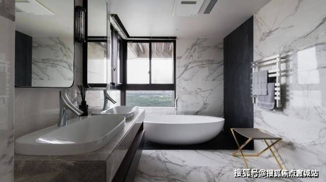 ▲墙面、地面处都是以白色砖的设计,靠窗布置一个大浴缸,结合双人位的台上盆洗手盆,也让卫浴空间显得更加干净简洁而时尚大方.