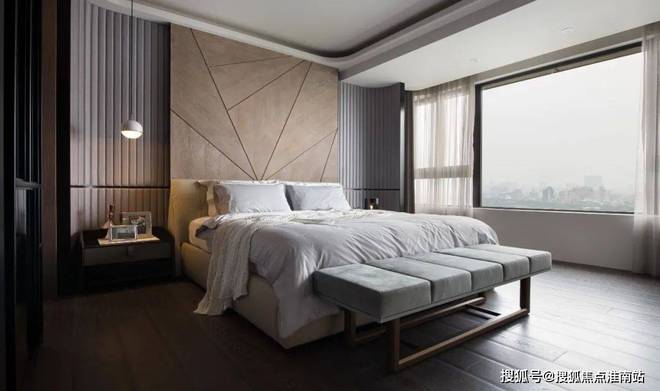 ▲卧室床头墙加入木饰面,两侧是弧形的软包质感的波纹造型板,摆上米白色的皮艺床,简约舒适的床单,床尾还有一张长凳子,整体现代优雅的卧室空间,为主人提供了一个舒适从容的休闲与睡眠体验.