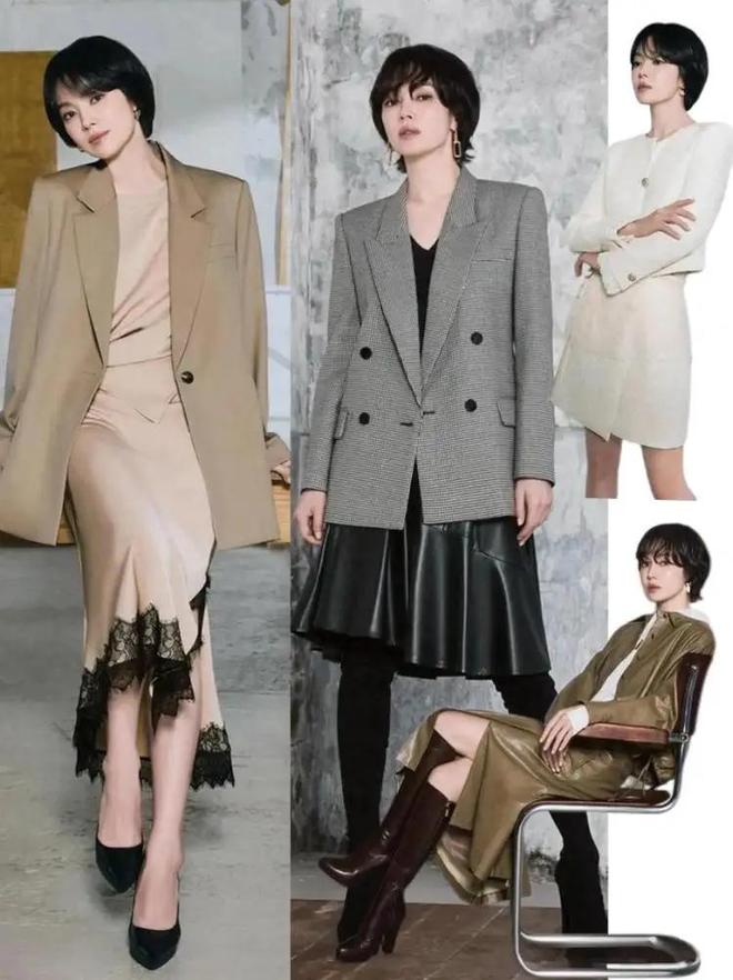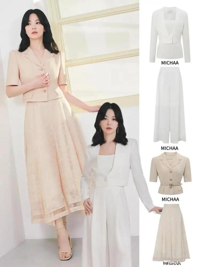 咱们还可以用西装外套来搭配上裙子,西装外套穿在身上挺括有型,例如下面这一件卡其色的西装搭配上杏色的裙子,而且这条裙子的裙摆还做了一个黑蕾丝设计,看起来会更别致。