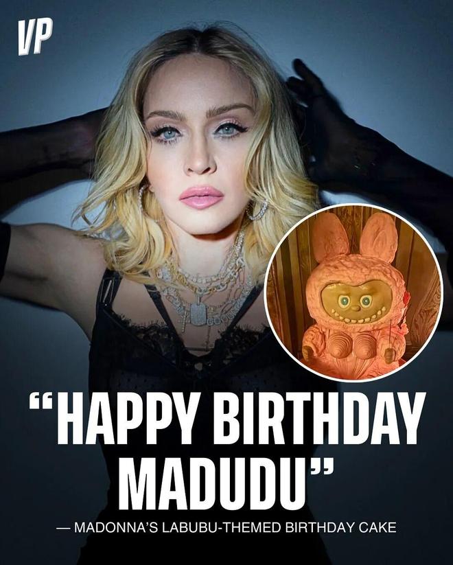 人生的第67个生日,麦当娜把生日蛋糕做成了Labubu的形状。在8月16日的生日宴上,一只粉色的毛绒怪物竖着一对兔子耳朵,咧开大嘴露出一排尖牙,穿着这位流行天后标志性的Cone Bra坐在蛋糕上。麦当娜把它叫作“Madudu”。