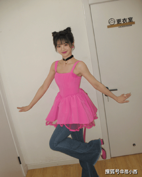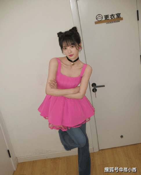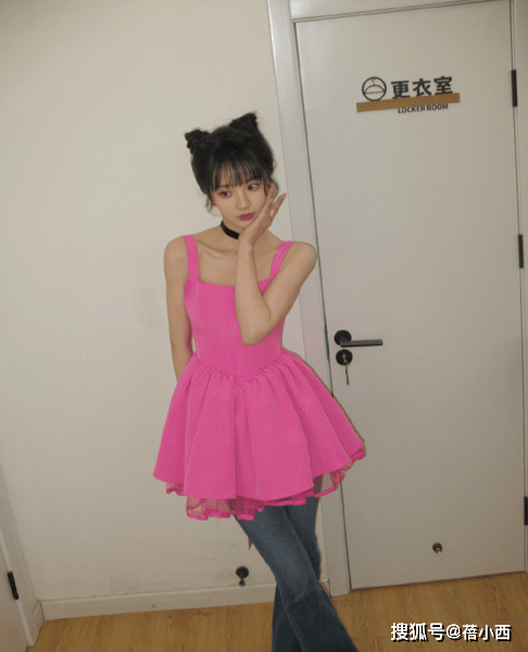 谈到颜色,粉色并非所有人都能驾驭。要把它穿出高级感,通常需要白皙的肤色和天然的气质支撑。田曦薇这件芭比粉连衣裙以蓬蓬裙与蕾丝点缀,呈现出甜美洋娃娃的气质;下装选择喇叭裤,进一步增强了整体的设计感与轮廓感,使得造型更具层次。